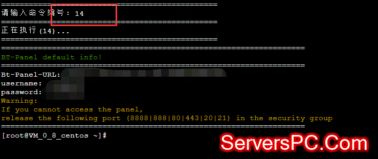 4. 这时候我们输入数字14,就能看到宝塔面板的登录地址还有用户名和密码。