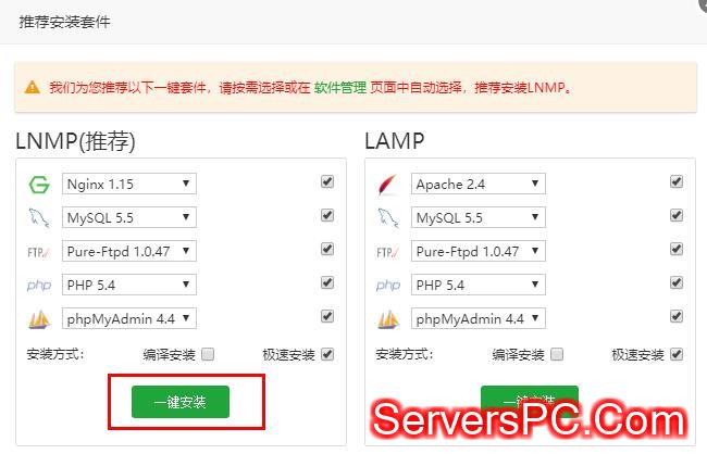 5.我们把登录地址复制到浏览器打开,输入用户名和密码,进入到宝塔面板的后台管理页面。一般来说, 首次登陆进来面板后,会自动推荐你安装环境套件,这里有两种选择,第一种是LNMP套件,第二种是LAMP套件 。如图(建议选择一键安装LNMP)