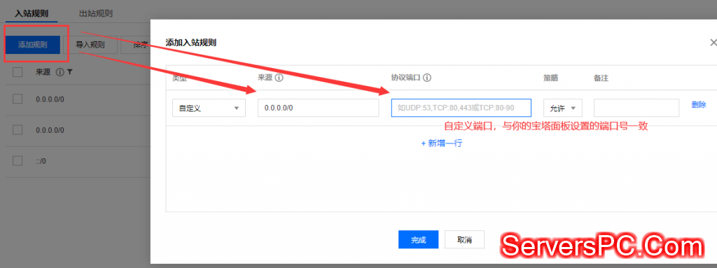 注意:修改面板端口之前,记得在你的阿里云或者腾讯云控制台,找到你的云服务器,在“安全组”一栏下修改规则,选择入站规则下的“添加规则”。