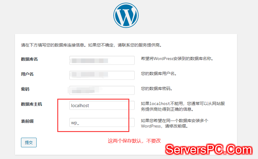 8.输入你的网站信息,即你的域名。另外,为了避免出现不可知的错误,新手建议不要修改默认创建的数据库名和命令,自己把它存储好就行。(当点击提交后,系统会自动列出数据库名和密码以及网站地址,请保存好这些信息,后面进入WordPress安装需要填写)