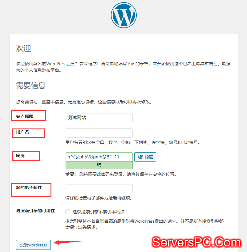 10. 安装完成后,登陆你的Wordpress管理后台。(后台登陆地址为:你的网址或ip/wp-admin)