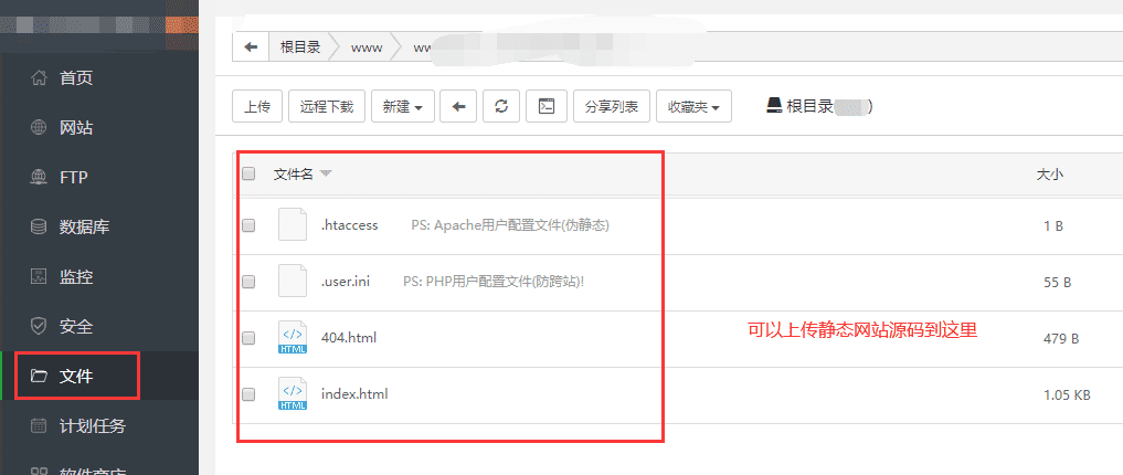 14.接着你可以将你的静态网站源码上传到你的网站目录里,也可以手动部署WordPress网站(需要在上一步里创建数据库)。