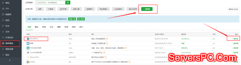 7.下面我们开始来一键部署WordPress建站程序,(提示:如果前面你没有安装LNMP环境或者LAMP环境,也不要着急,我们可以在软件搜索步骤5列出的几个套件手动安装),点击面板左侧“软件商店”,然后找到WordPress,选择一键部署。