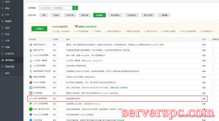 方法2:同样在宝塔面板管理后台,找到“软件商店”–>宝塔插件,找到“宝塔一键部署源码”,或者在应用搜索框中搜索“宝塔一键部署源码”,然后安装该插件。