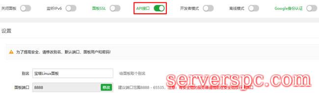 1、登录迁入云服务器的宝塔 Linux 面板。2、选择左侧菜单栏中的【面板设置】,并在设置页面中开启 API 接口。如下图所示:
