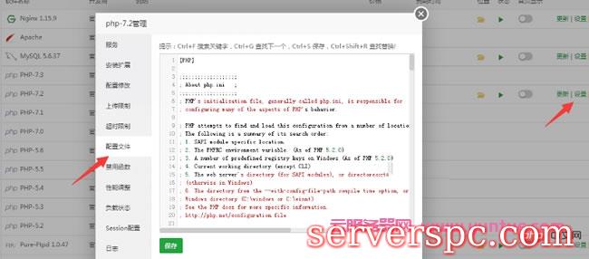 如果不想这么麻烦去找 php.ini 文件,其实我们还有一种比较简单的方法定位到 php.ini 文件,就是点击宝塔 Linux 面板左侧的“软件管理”>> 运行环境,找到相应的 PHP 版本,如 PHP7.2,点击它右侧对应的“设置”链接按钮进入到“PHP-7.2 管理”>> 点击左侧的“配置文件”即可打开 php.ini 文件,接着就可以直接编辑该文件了,最后记得点击【保存】按钮即可。