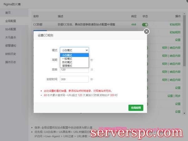 这里的周期指的是多长时间内。某个IP 触发的频率。进行拦截。如上的意思是:单个IP 请求一个URI 60s 内请求超过120 次。进行封锁300秒