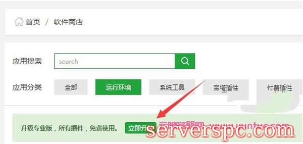 1、登录宝塔 Web 面板 >> 点击左侧菜单“软件商店”,一般都能看到一个“升级专业版,所有插件,免费使用。”提示,我们直接点击【立即升级】按钮。具体如下图所示: