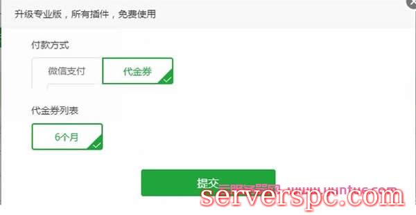 2、在付款方式中选择“代金券”,在代金券列表中就能看到一个“6 个月”,这个就是所获赠送的宝塔面板半年专业版,确认无误后点击【提交】按钮即可。