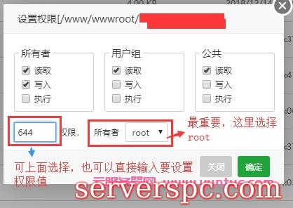弹出的“设置权限”,对话框中,设置要设置的权限值,可以直接输入设置权限值,也可以鼠标点选权限,重要地方是所有者一定要选择为“root”,这样即可成功。以前没有成功原因是默认所有者为”www”。