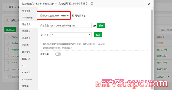提示:防跨站攻击配置文件就是根目录下的.user.ini文件,也手动可以根据实际目录路径修改,开启或者关闭防跨站攻击有可能需要重启下PHP(宝塔面板后台软件管理找到对应的PHP版本点击“设置”—“重启”),其次就是检查网站运行目录是否设置正确,有一些用户在搭建网站上传源码程序的时候会多一个目录文件,如果源码程序在这个文件夹内,就需要设置选择正确的运行目录,否则也会出现问题,如果程序是解压在根目录请忽略这个问题。