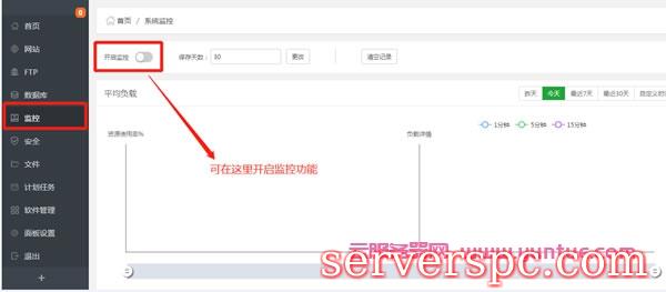 (1)首先登陆你的宝塔面板后台,在左侧找到【监控】菜单,进入监控菜单页面后,如果监控未开启,则不会查看到数据,运维人员可自行开启监控功能,如下图: