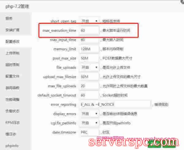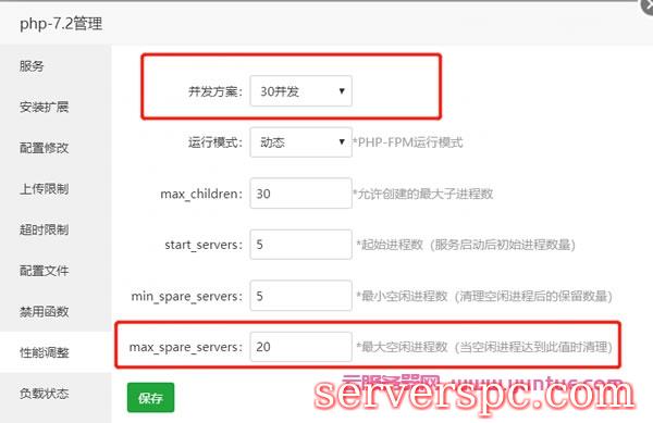 接着在配置修改选择将最大脚本运行时间修改为60,最后将并发方案设为30并发(注意:宝塔面板通常会自动根据你的服务器配置给你设置合适的并发,如果你觉得不够用可以自己设置),接着在性能调整中将最大空闲进程数设置为20。如下图: