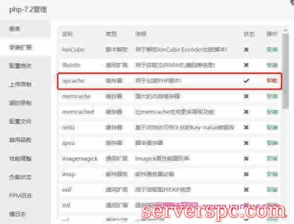 比如,我们安装的是宝塔Linux面板,建站环境所使用的是LNMP,Nginx 1.15、MySQL 5.5、PHP-7.2,基本情况了解了下面直接看操作。首页,进入php7.2的管理页面,选择安装一个opcache缓冲器,用于加速PHP脚本,如下图: