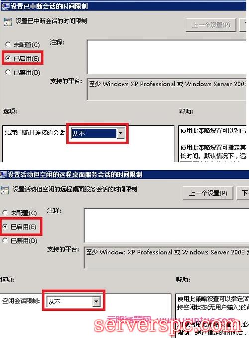 和2008系统一样,同样将”为断开的会话设置时间限制“和”到达时间限制时终止会话“这两个设置启用,并把对应的选项都设置为”从不“(同上图2008的界面一样)。