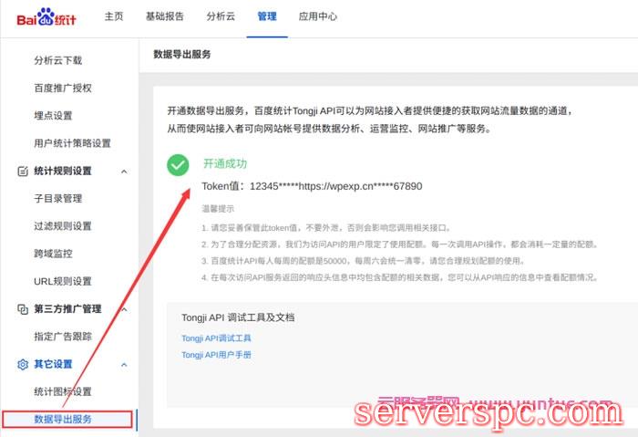百度统计的 Token 值可以自行申请开通:在百度统计右上角选择对应站点,点击顶部导航菜单的管理,然后在左侧菜单底部找到其他设置→数据导出服务,选择开通即可获得百度统计 Token 值。具体可参见下图: