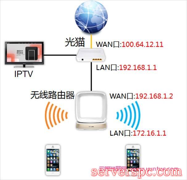 举个例子:在家庭无线网络中,光猫路由模式连接宽带,LAN口下接无线路由器提供无线网络联网,如下图所示是一个正常家用无线网络的结构图。