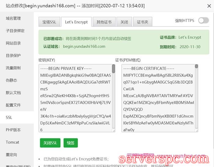 在宝塔面板申请的ssl证书为Let’s Encrypt免费证书,有效期3个月,默认会自动续签的。
