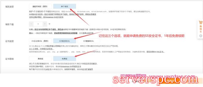 然后,依次点击单“单个域名”->“DV域名级SSL”->“免费版”,然后就可以申请!