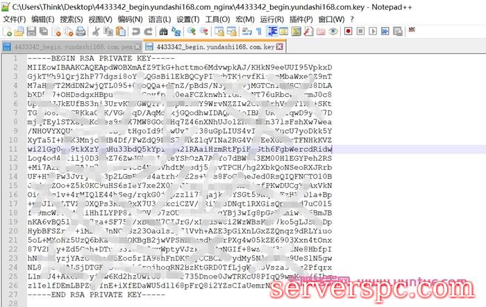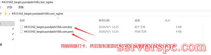 看见没,关键的两个文件“.key”和“.pem”,用记事本编辑器打开,然后复制到宝塔面板后台ssl自定义编辑框中。