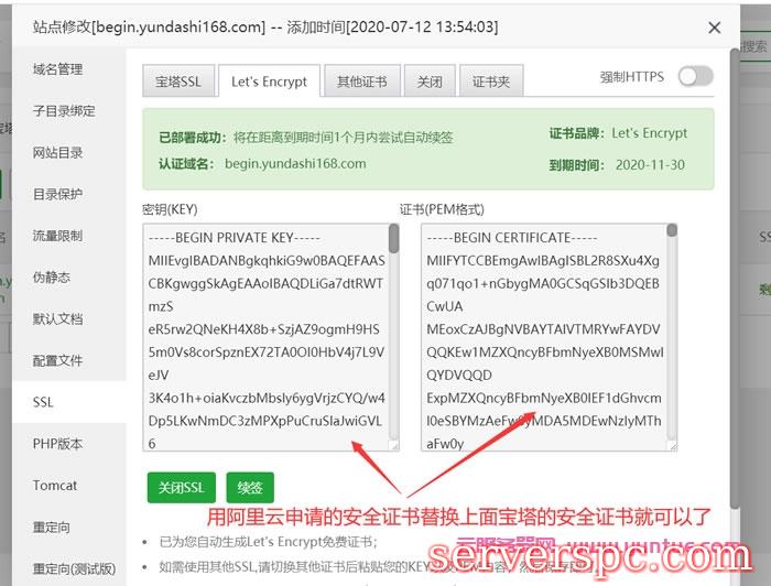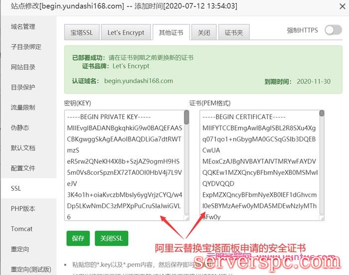 然后,将阿里云安全证书或者其它SSL证书的相关key和pem填入其中!