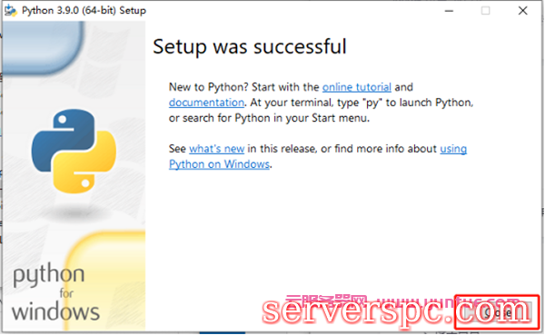 5)等待安装完成,当跳出如下界面时,恭喜你,Python 3.9.0 已经安装成功了,点击关闭(Close)即可: