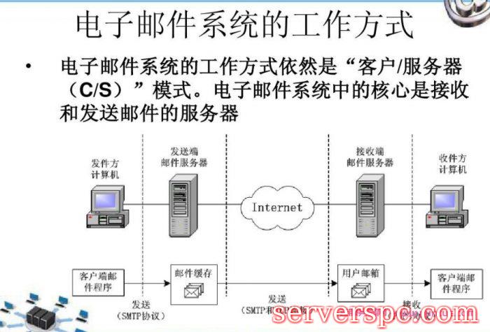 电子邮件服务器与其它程序协同工作用以组成有时被称作消息系统的内容。消息系统包括了所有必要的应用程序来保证电子邮件按照应有的路径传送。当你发送电子邮件消息时,你的电子邮件程序,如Outlook或Eudora,发送消息到你的邮件服务器,它再依次发送到其它邮件服务器或同一服务器的保存区,过后再发送出去。