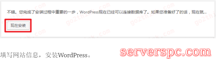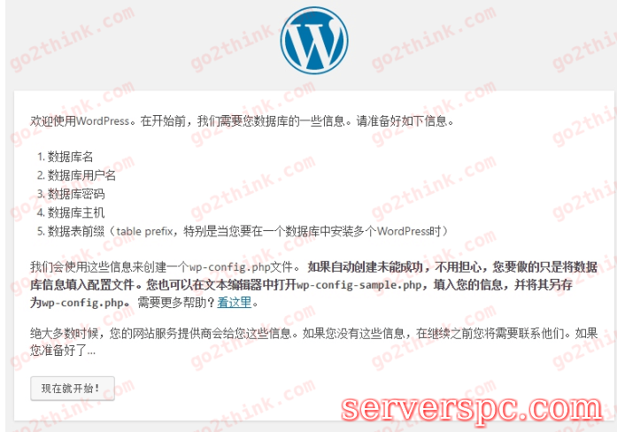 搭建完成,访问站点,“现在开始”,按提示配置 WordPress。