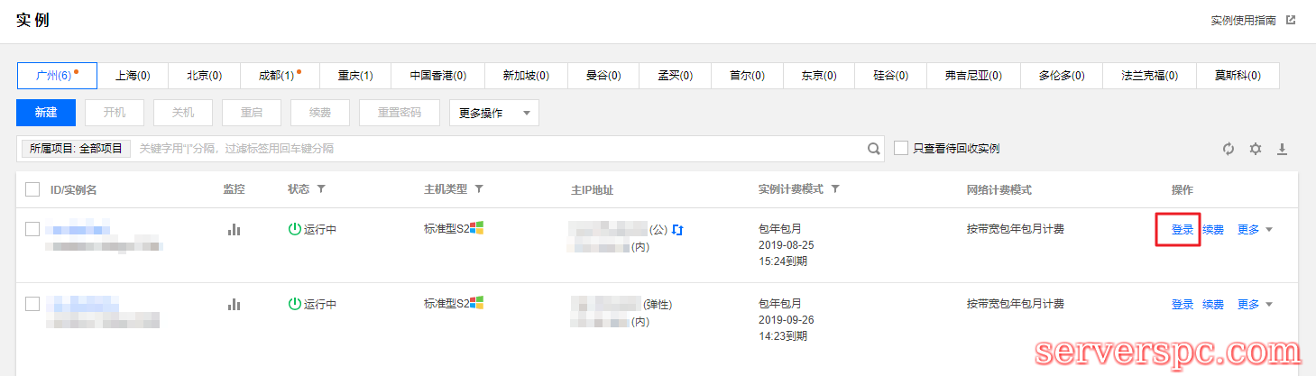 在实例的管理页面,选择需要登录的 Windows 云服务器,单击【登录】。如下图所示: