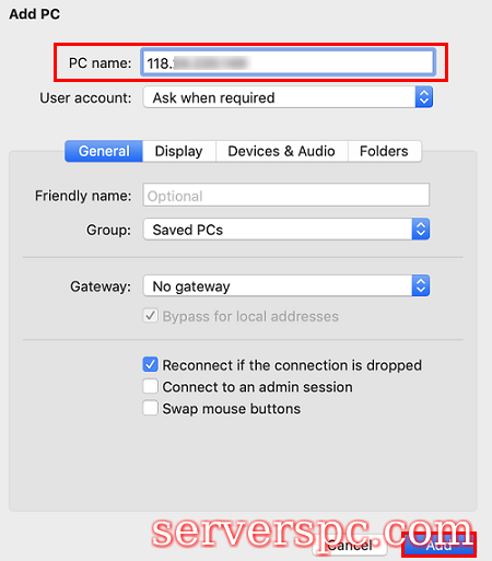 在 “PC name” 处输入云服务器公网 IP。