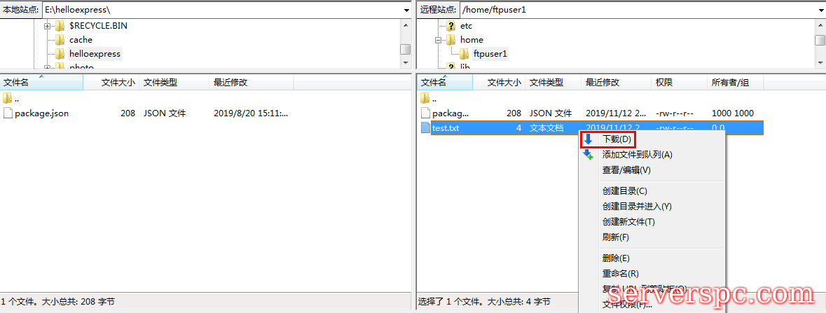 在右下方“远程站点”窗口中,右键单击待下载的云服务器文件,选择【下载】,即可将文件下载到本地。如下图所示: