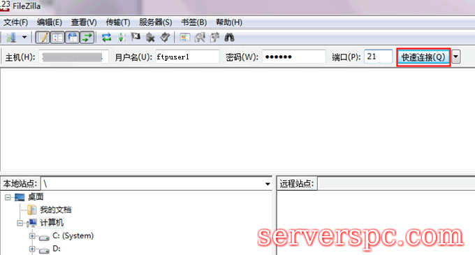 在 FileZilla 窗口中,填写主机、用户名、密码和端口等信息,单击【快速连接】。如下图所示: