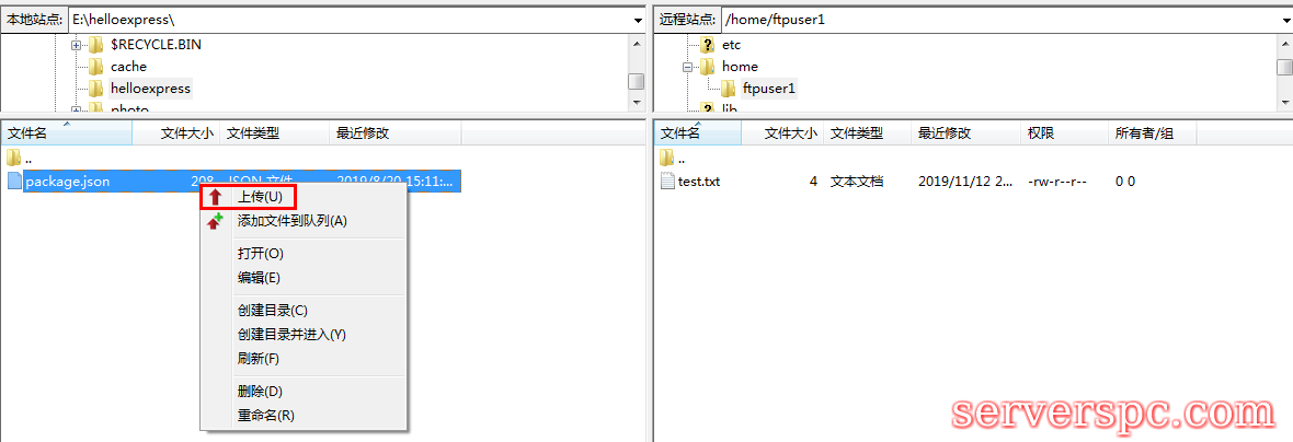 在左下方的“本地站点”窗口中,右键单击待上传的本地文件,选择【上传】,即可将文件上传到 Linux 云服务器。如下图所示: