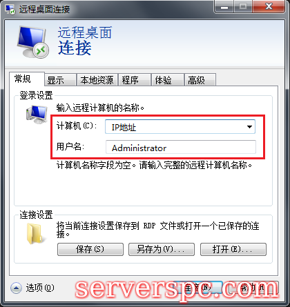 在【常规】页签中,输入云服务器公网 IP 地址和用户名 Administrator。如下图所示: