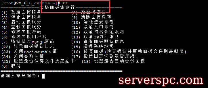 安装完成后,我们接着再命令行输入bt,这个时候就会显示面板的使用帮助菜单选项。