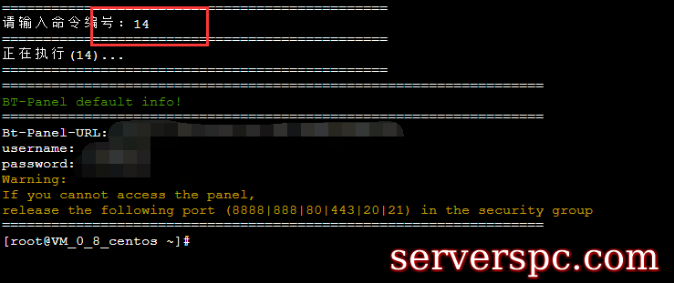 4. 这时候我们输入数字14,就能看到宝塔面板的登录地址还有用户名和密码。