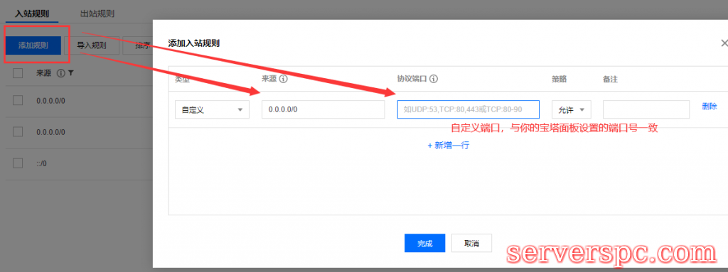 注意:修改面板端口之前,记得在你的阿里云或者腾讯云控制台,找到你的云服务器,在“安全组”一栏下修改规则,选择入站规则下的“添加规则”。