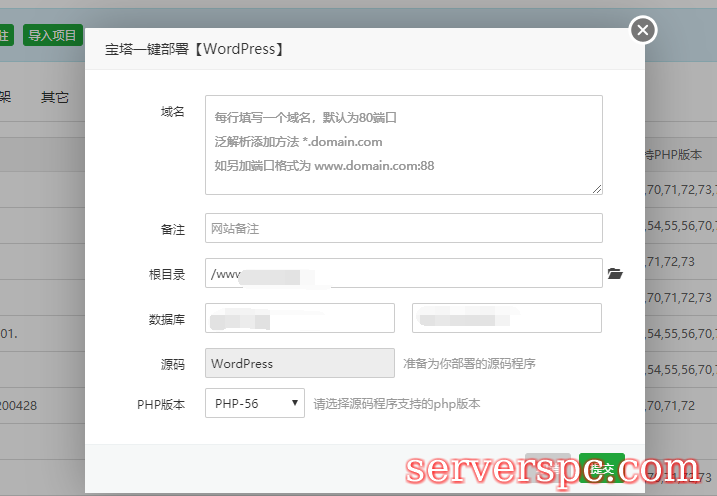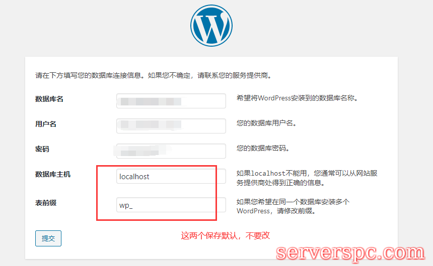 8.输入你的网站信息,即你的域名。另外,为了避免出现不可知的错误,新手建议不要修改默认创建的数据库名和命令,自己把它存储好就行。(当点击提交后,系统会自动列出数据库名和密码以及网站地址,请保存好这些信息,后面进入WordPress安装需要填写)