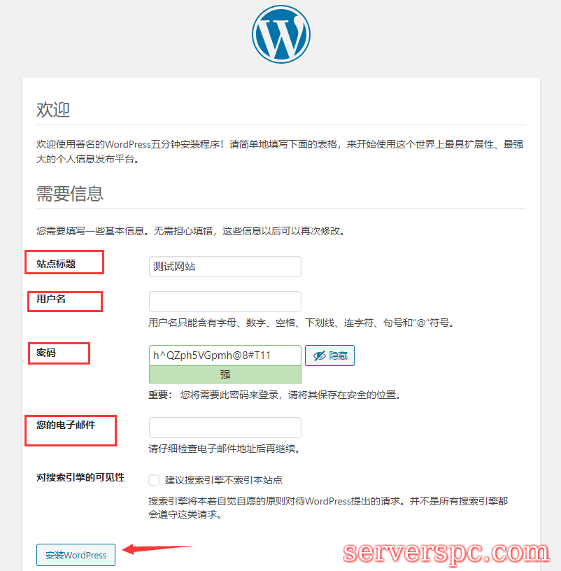10. 安装完成后,登陆你的Wordpress管理后台。(后台登陆地址为:你的网址或ip/wp-admin)