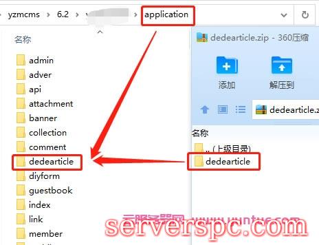 下载安装转换插件–>dedecm转换至yzmcms插件,下载完成后解压,将得到的整个文件夹,放置网站根目录下的application文件夹内,如下图所示: