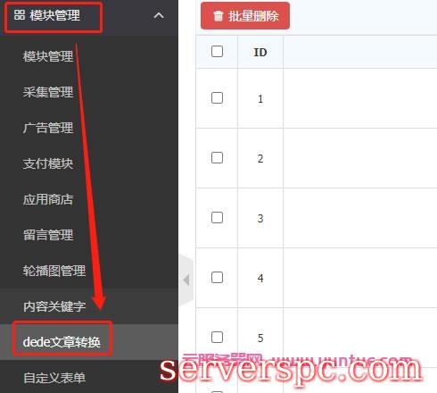 安装完成后,刷新下页面,即可在左侧菜单栏【模块管理】下看到【dede文章转换】插件,点击则会自动同步原dedecms网站上的文章内容过来,转换时间由文章数量而定,目前设定的时间为每3秒转换一篇文章,静待装换完成即可,注意:转换期间请勿关闭页面。