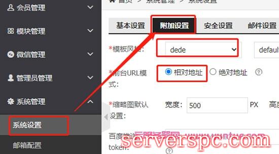 完成第六步后,回到网站后台,在左侧菜单栏找到【系统管理】–>【系统设置】–>【附加设置】,按照下图所示设置好后,点击保存。