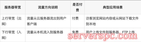 从服务器角度,上行带宽是指出流量、下行带宽是指入流量。以阿里云服务器为例,用户购买的公网带宽指的是上行带宽,流量从云服务器流到用户客户端的流量,下行带宽是免费的,用户上传文件到服务器是免费的。
