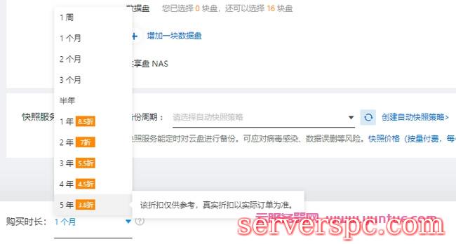 咱们以阿里云购买页为例简单看下,阿里云服务器提供1年8.5折、2年7折、3年5.5折、4年4.5折、5年3.8折的优惠,而如果单纯月租的话,无任何优惠。
