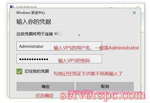 然后会提示你输入用户凭证,这个时候你就输入VPS的用户名(一般是Administrator)和密码,勾选上“记住凭证”(方便下次登录的时候不用重新输入用户名和密码了),点击“确定”,这时候就会开始连接了: