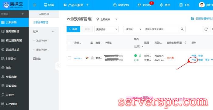 点击对应云服务器的【升级】操作,如图所示: