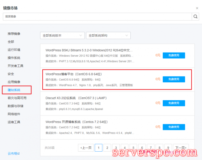 在弹出的【镜像市场】对话框中,选择【建站系统】> 【WordPress博客平台】,单击【免费使用】。如下图所示: