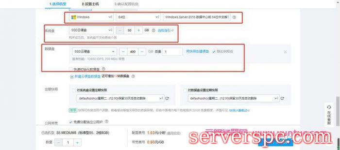 系统盘是云硬盘SSD 50G,数据盘挂载云硬盘SSD 400G,选择“按使用流量计费”。