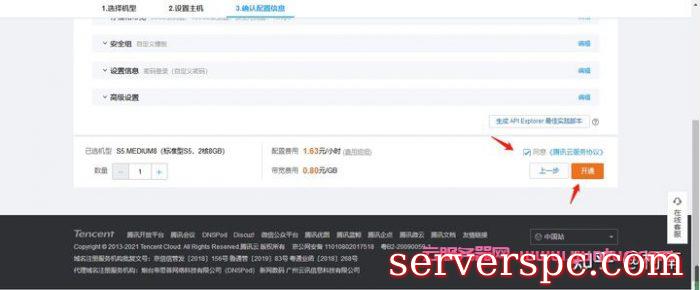 勾选“腾讯云协议”,点击“开通”(必须保证账号余额不低于10元,所以最好先充值好)